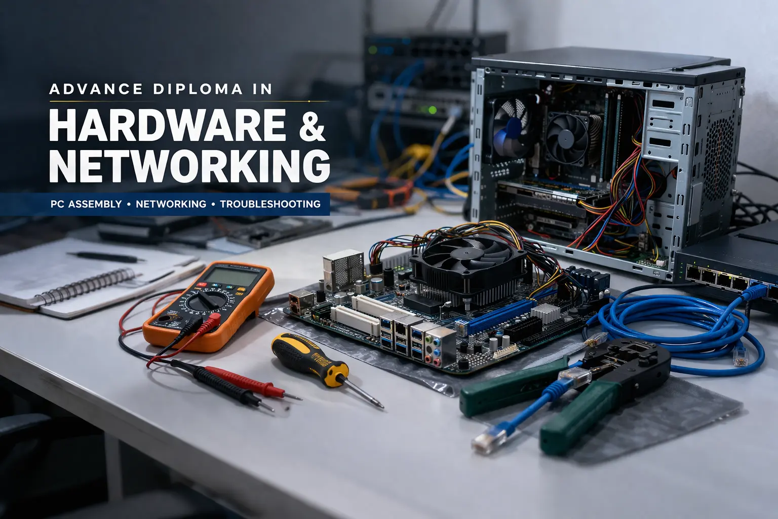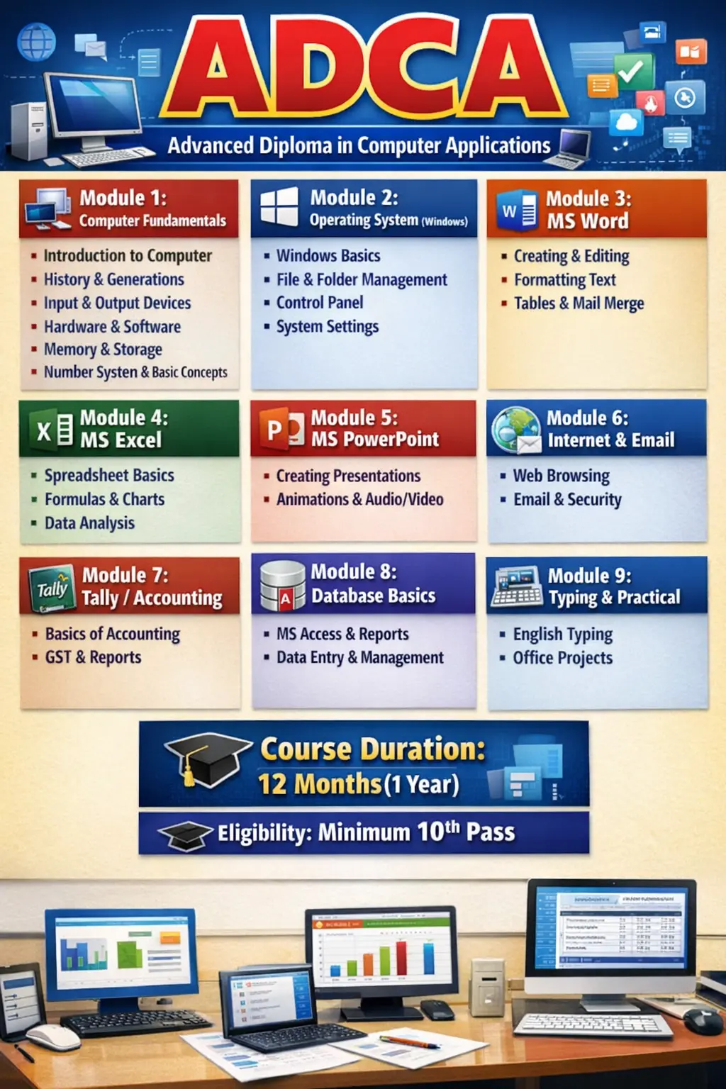 Students learn about operating systems, MS Office (Word, Excel, PowerPoint), internet usage, and basic programming concepts. The course also includes typing practice, data entry, and working with common software used in offices.